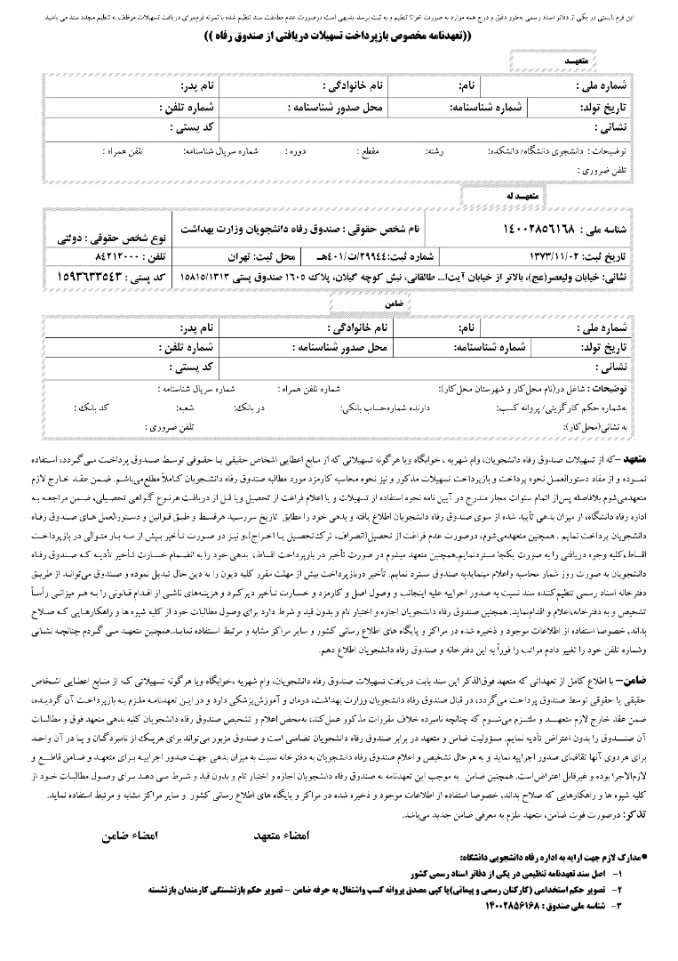* فرم تعهدنامه محضری بازپرداخت تسهیلات دریافتی از صندوق رفاه